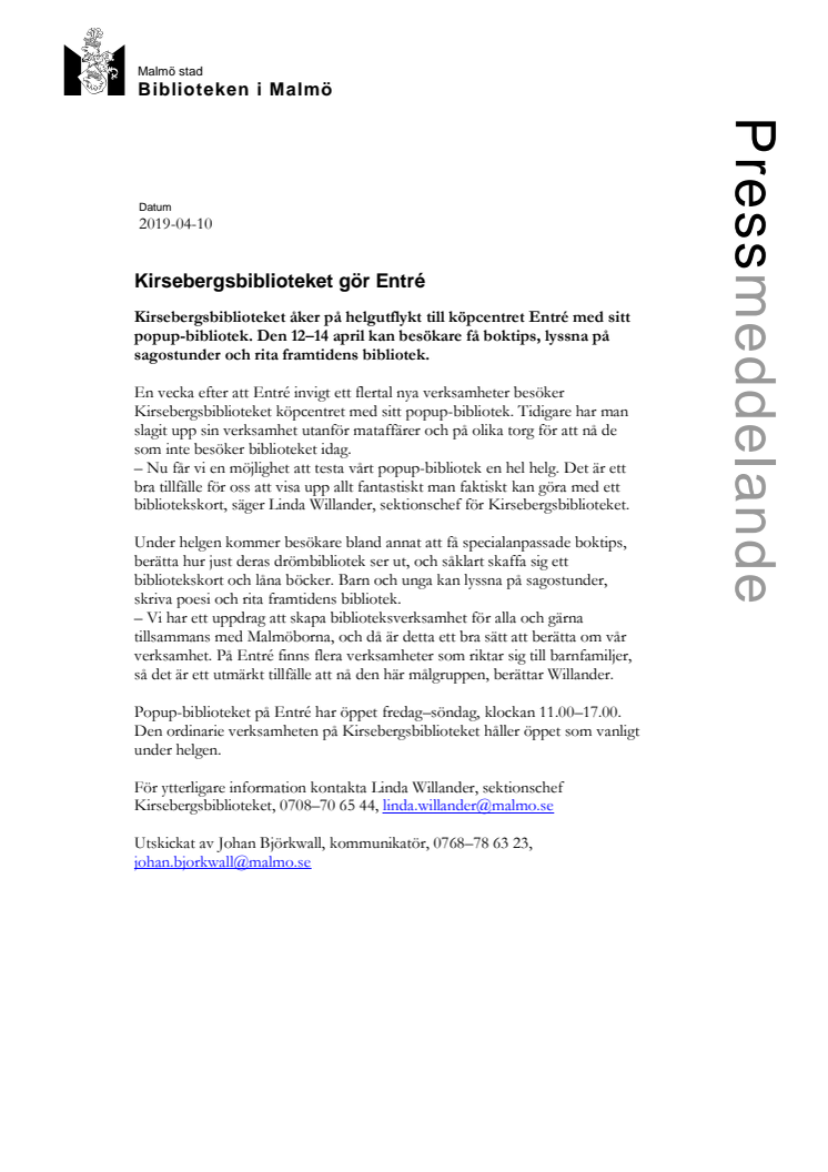 Kirsebergsbiblioteket åker på helgutflykt till köpcentret Entré med sitt popup-bibliotek. Den 12–14 april kan besökare få boktips, lyssna på sagostunder och rita framtidens bibliotek.