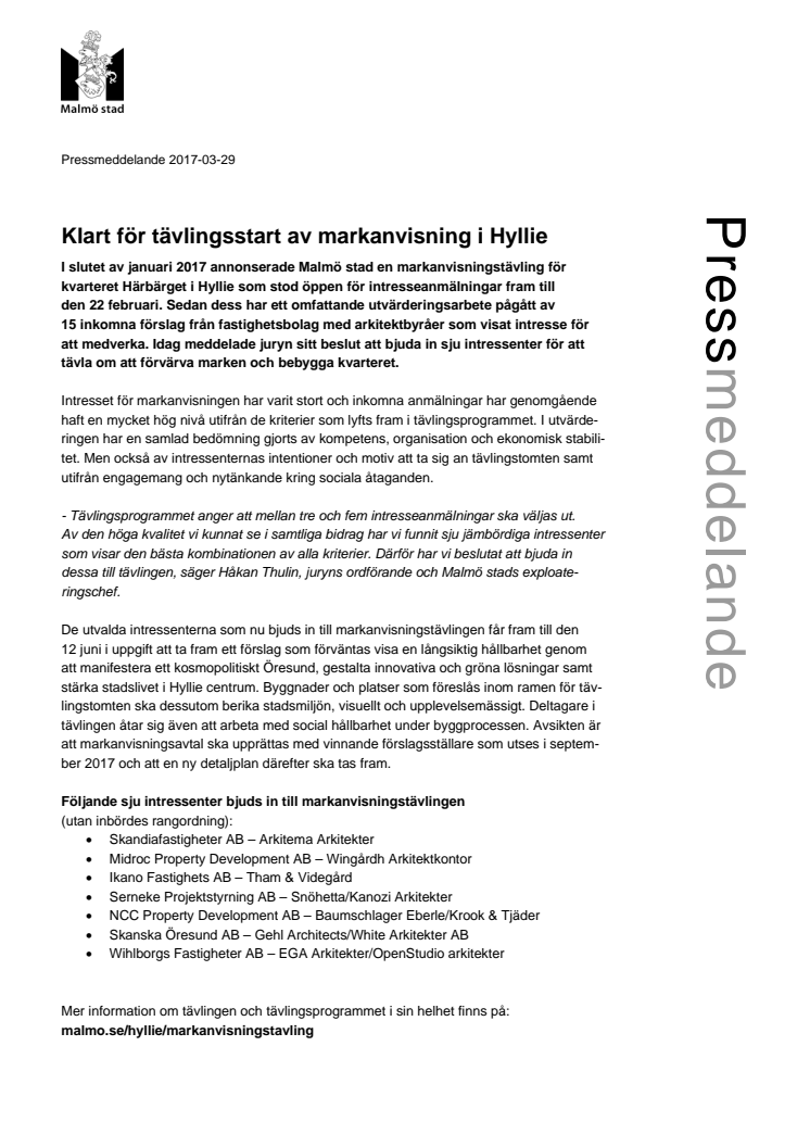 I slutet av januari 2017 annonserade Malmö stad en markanvisningstävling för kvarteret Härbärget i Hyllie som stod öppen för intresseanmälningar fram till den 22 februari. Sedan dess har ett omfattande utvärderingsarbete pågått av