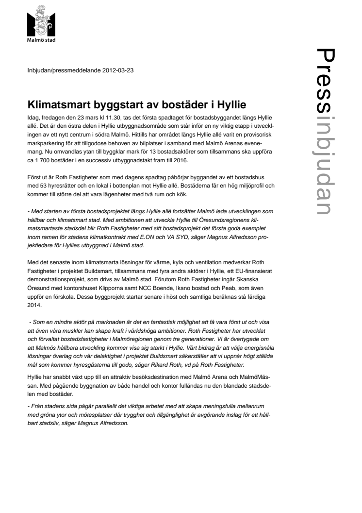 Fredagen den 23 mars togs det första spadtaget för bostadsbyggandet längs Hyllie allé - den östra delen i utbyggnadsområdet som hittills varit en provisorisk markparkering. Här ska 1 700 bostäder stå klara 2016. Först ut är Roth Fastigheter AB med 53 klimatsmarta hyresrätter. Byggandet av bostäderna ingår i projektet Buildsmart inom ramen för Malmö stads klimatkontrakt med E.ON och VA SYD.