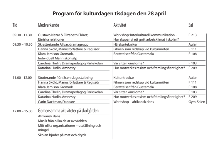 Komvux Kronborg i Malmö arrangerar kulturdag den 28 april. Temat är kulturmöten och det blir bl a internationell musik och dans. Läs programmet här.