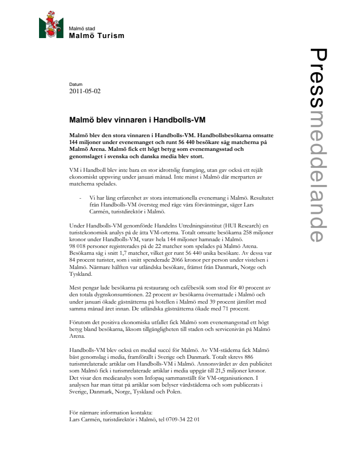 Malmö blev den stora vinnaren i Handbolls-VM. Handbollsbesökarna omsatte 144 miljoner under evenemanget och runt 56 440 besökare såg matcherna på Malmö Arena. Malmö fick ett högt betyg som evenemangsstad och genomslaget i svenska och danska media blev stort.
