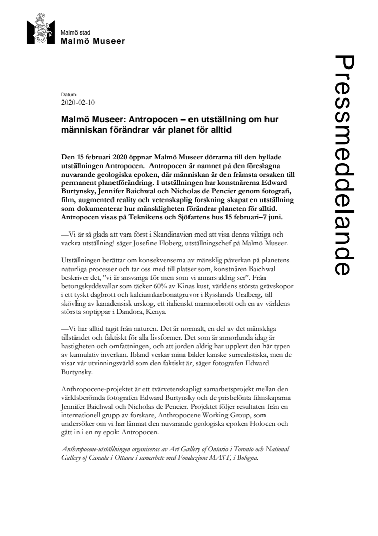 Den 15 februari 2020 öppnar Malmö Museer dörrarna till den hyllade utställningen Antropocen. Det är också namnet på den föreslagna nuvarande geologiska epoken. Konstnärerna Edward Burtynsky, Jennifer Baichwal och Nicholas de Pencier har genom fotografi, film, augmented reality och vetenskaplig forskning skapat en utställning som dokumenterar hur mänskligheten förändrar planeten för alltid.