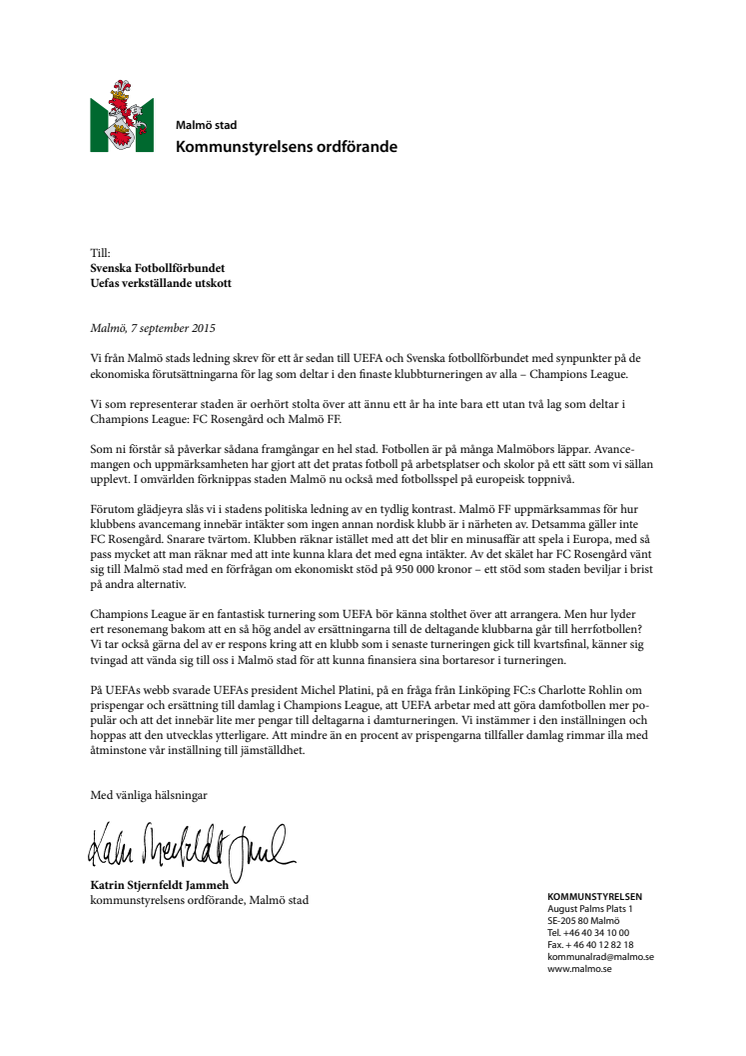 Malmö stad skriver till Uefa om ojämställda ersättningar