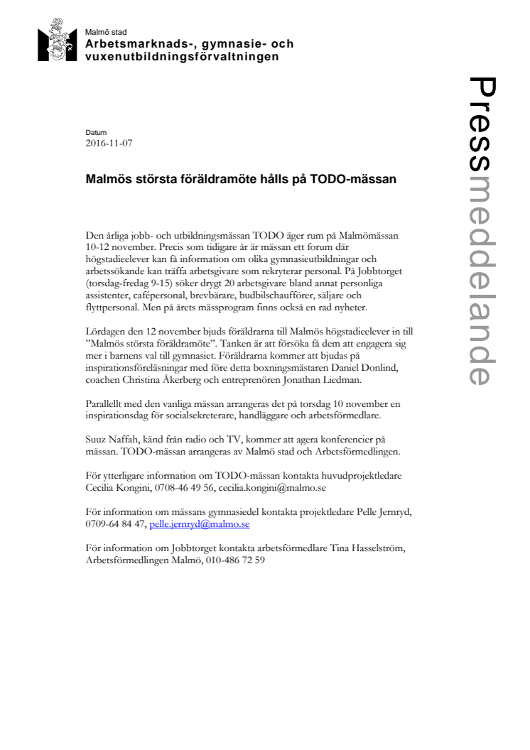 Den årliga jobb- och utbildningsmässan TODO äger rum på Malmömässan 10-12 november. Precis som tidigare år är mässan ett forum där högstadieelever kan få information om olika gymnasieutbildningar och arbetssökande kan träffa arbetsgivare som rekryterar personal. Men på årets mässprogram finns också en rad nyheter, bland annat "Malmös största föräldramöte".