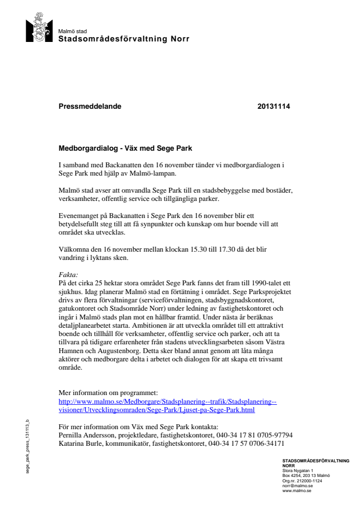 I samband med Backanatten den 16 november tänder vi medborgardialogen i Sege Park med hjälp av Malmö-lampan. Malmö stad avser att omvandla Sege Park till en stadsbyggelse med bostäder, verksamheter, offentlig service och tillgängliga parker. Välkomna den 16 november mellan klockan 15:30 till 17:30 då det blir vandring i lyktans sken.