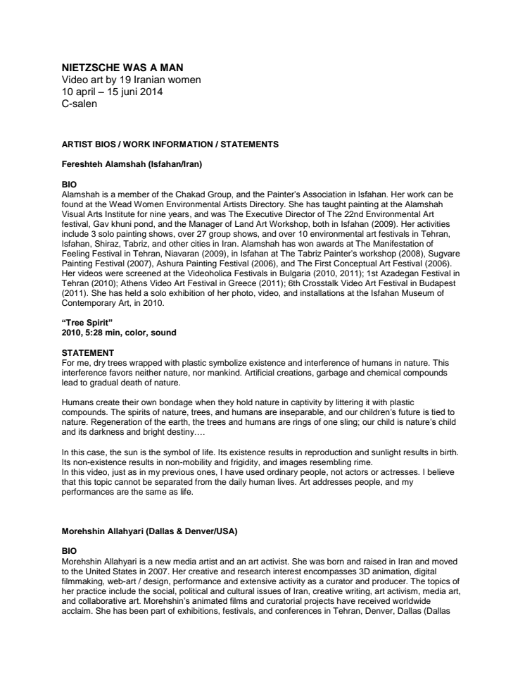 Nietzsche Was A Man visar filmer av 19 iranska kvinnliga konstnärer, som undersöker universella frågor om genus, fördomar, identitet, våld och relationen mellan människan och hennes miljö.