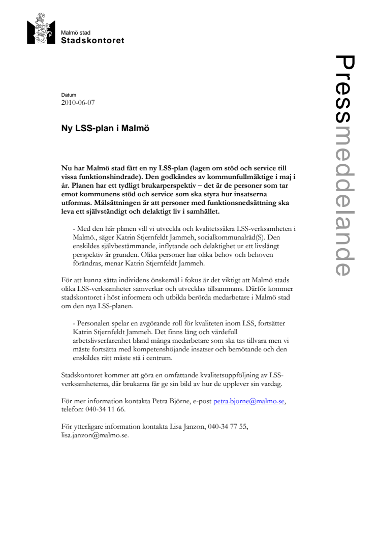 Nu har Malmö stad fått en ny LSS-plan (lagen om stöd och service till vissa funktionshindrade). Den godkändes av kommunfullmäktige i maj i år. Planen har ett tydligt brukarperspektiv – det är de personer som tar emot kommunens stöd och service som ska styra hur insatserna utformas. Målsättningen är att personer med funktionsnedsättning ska leva ett självständigt och delaktigt liv i samhället.