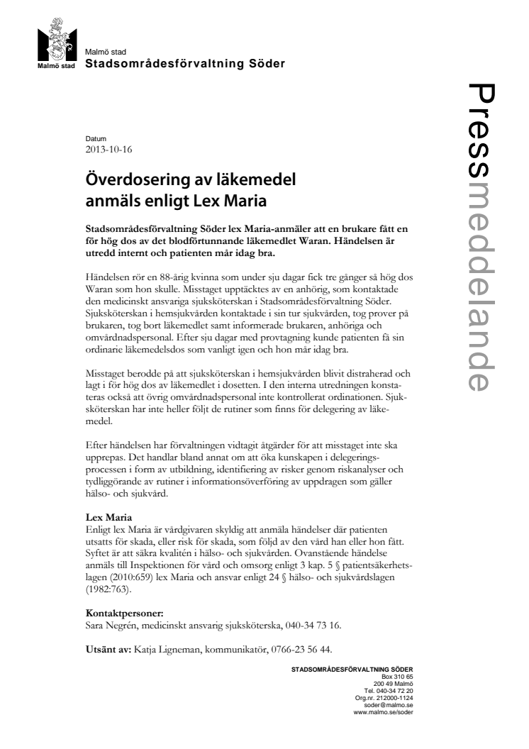 En 88-årig kvinna fick för hög dos av läkemedlet Waran. Händelsen anmäls nu enligt Lex Maria av Stadsområdesförvaltning Söder.