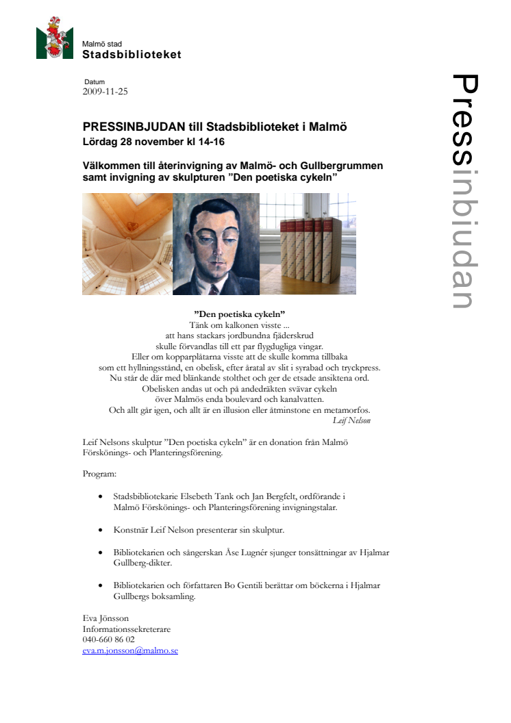 PRESSINBJUDAN till Stadsbiblioteket i Malmö: återinvigning av Malmö- och Gullbergrummen samt invigning av skulpturen ”Den poetiska cykeln”