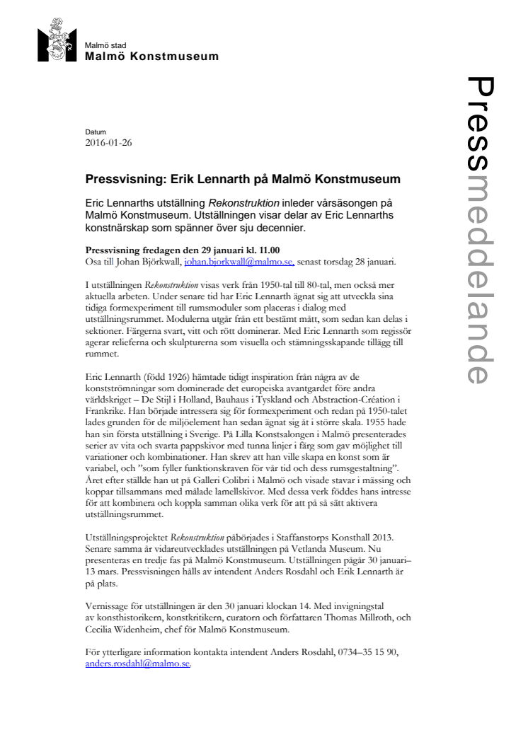 Eric Lennarths utställning Rekonstruktion inleder vårsäsongen på Malmö Konstmuseum. Utställningen visar delar av Eric Lennarths konstnärskap som spänner över sju decennier. Den 29 januari är det pressvisning, följt av vernissage dagen efter.