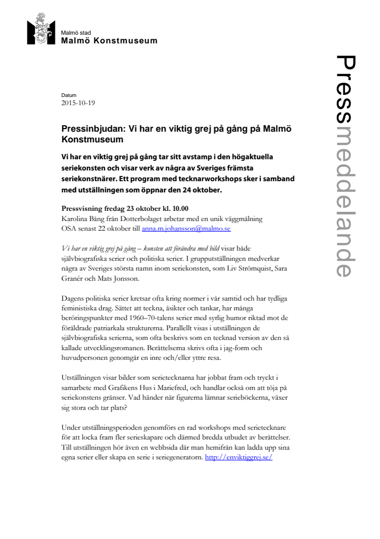 Vi har en viktig grej på gång tar sitt avstamp i den högaktuella seriekonsten och visar verk av några av Sveriges främsta seriekonstnärer. Ett program med tecknarworkshops sker i samband med utställningen som öppnar den 24 oktober. Pressvisning sker den 23 oktober klockan 10.00.