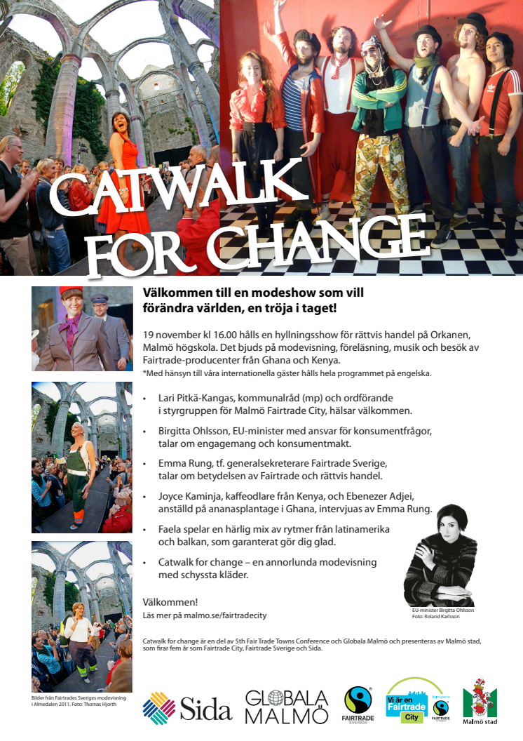 Catwalk for Change - modevisningen som vill förändra världen en tröja i taget! Kända och okända Malmöprofiler visar upp snygga arbetskläder i Fairtrade-märkt bomull. !9711 kl 16.00 på Orkanen, Malmö högskola.