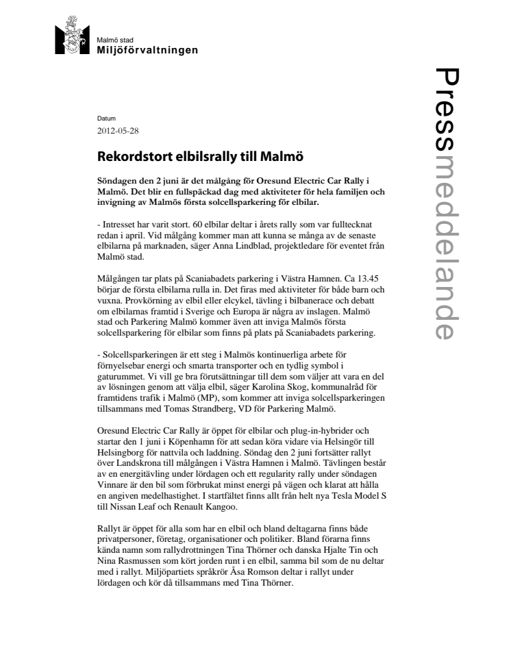Söndagen den 2 juni är det målgång för Oresund Electric Car Rally i Malmö. Det blir en fullspäckad dag med aktiviteter för hela familjen och invigning av Malmös första solcellsparkering för elbilar.