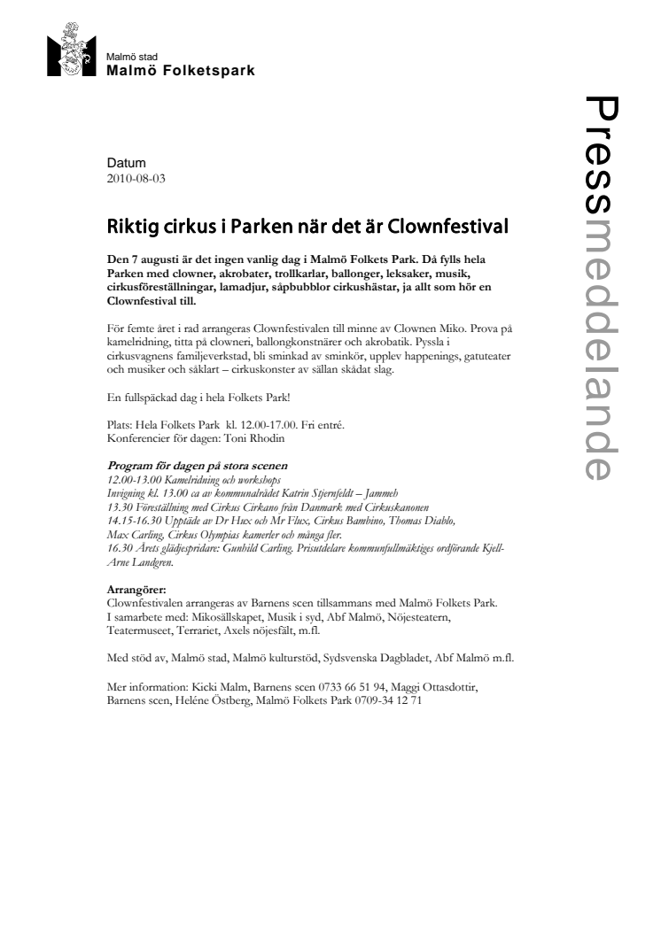 Den 7 augusti är det ingen vanlig dag i Malmö Folkets Park. Då fylls hela Parken med clowner, akrobater, trollkarlar, ballonger, leksaker, musik, cirkusföreställningar, lamadjur, såpbubblor cirkushästar, ja allt som hör en Clownfestival till.