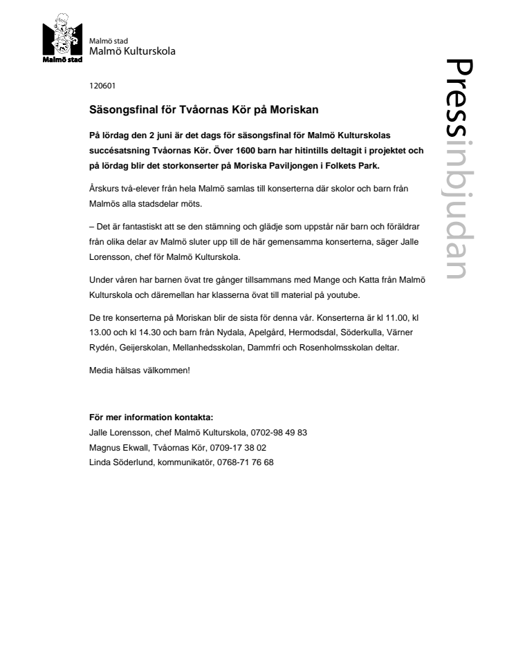 På lördag den 2 juni är det dags för säsongsfinal för Malmö Kulturskolas succésatsning Tvåornas Kör. Över 1600 barn har hitintills deltagit i projektet och på lördag blir det tre storkonserter på Moriska Paviljongen i Folkets Park.