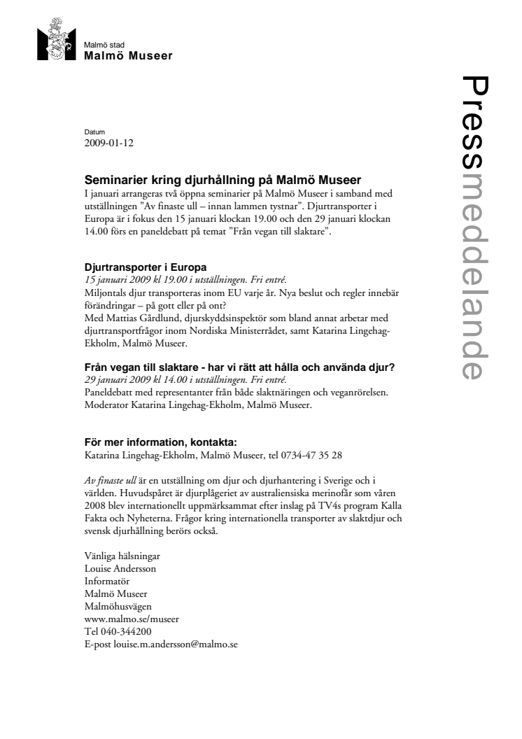 Under januari arrangeras två öppna seminarier på Malmö Museer i samband med utställningen ”Av finaste ull – innan lammen tystnar”. Djurtransporter i Europa är i fokus den 15 januari klockan 19.00 och den 29 januari klockan 14.00 förs en paneldebatt på temat ”Från vegan till slaktare”.