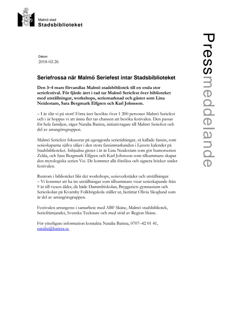 Den 3–4 mars förvandlas Malmö stadsbibliotek till en enda stor seriefestival. För fjärde året i rad tar Malmö Seriefest över biblioteket med utställningar, workshops, seriemarknad och gäster som Lina Neidestam, Sara Bergmark Elfgren och Karl Johnsson.