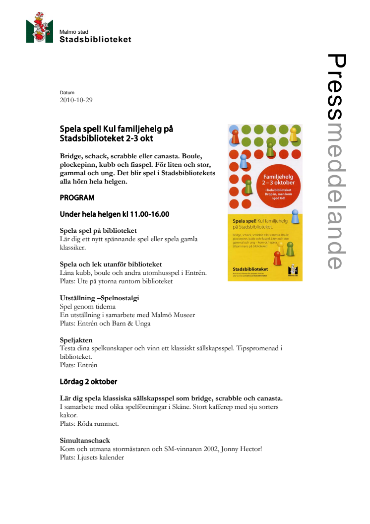 Familjehelg med alla sorters spel på Stadsbiblioteket. Bridge, schack, scrabble eller canasta. Boule, plockepinn, kubb och fiaspel. För liten och stor, gammal och ung. Det blir spel i Stadsbibliotekets alla hörn hela helgen.