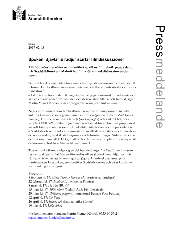Allt från könshierarkier och utanförskap till ny filmteknik pratas det om när Stadsbiblioteket i Malmö har filmkvällar med diskussion under våren. Ghost Town to Havana, premiärfilmen som visas den 8 februari, Djävulens jungfru och Oh Deer! är några av de filmer visas under våren.