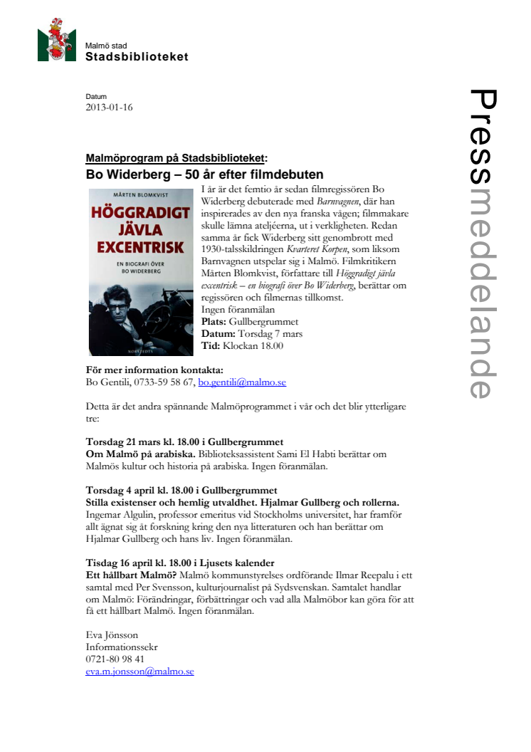 Nu är det dags för det andra Malmöprogrammet i vår på Stadsbiblioteket, "Bo Widerberg – 50 år efter filmdebuten". Mårten Blomkvist, författare till "Höggradigt jävla excentrisk – en biografi över Bo Widerberg", berättar om regissören och filmernas tillkomst.