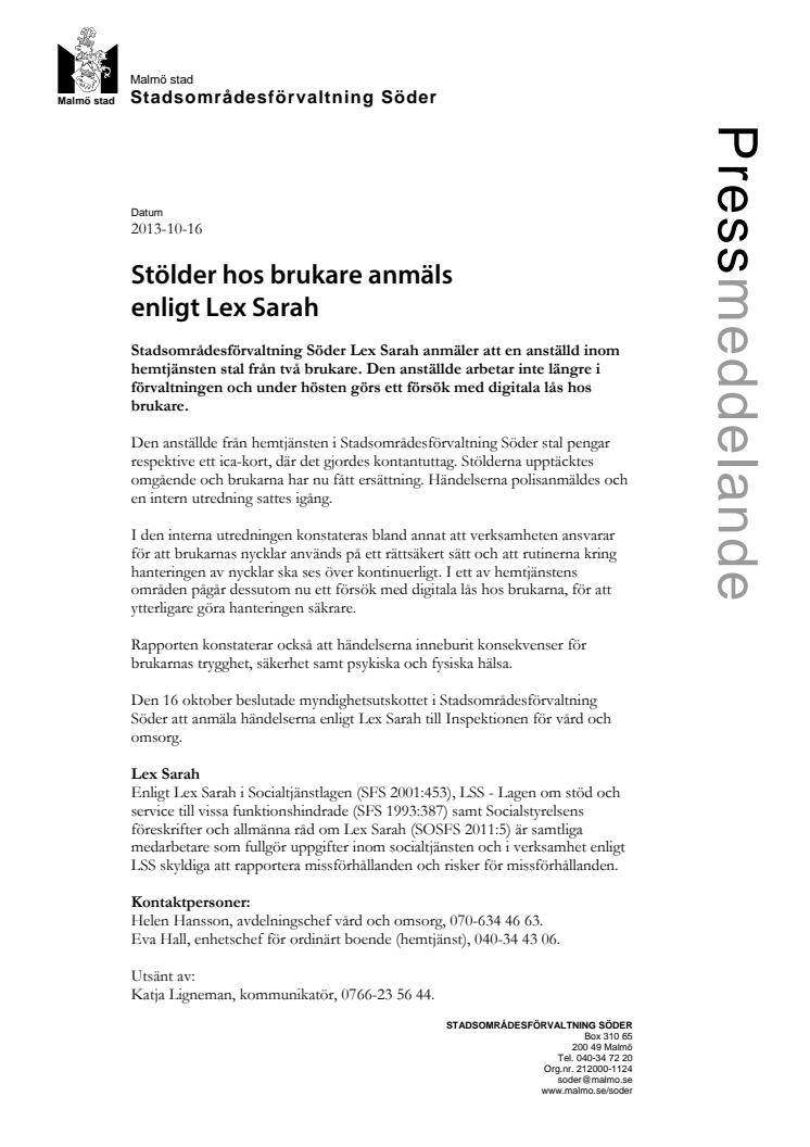 En anställd inom hemtjänsten stal från två brukare. Nu anmäler Stadsområdesförvaltning Söder händelsen enligt Lex Sarah.