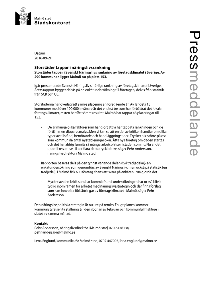 Storstäder tappar i Svenskt Näringslivs rankning av företagsklimatet i Sverige. Av 290 kommuner ligger Malmö nu på plats 153.