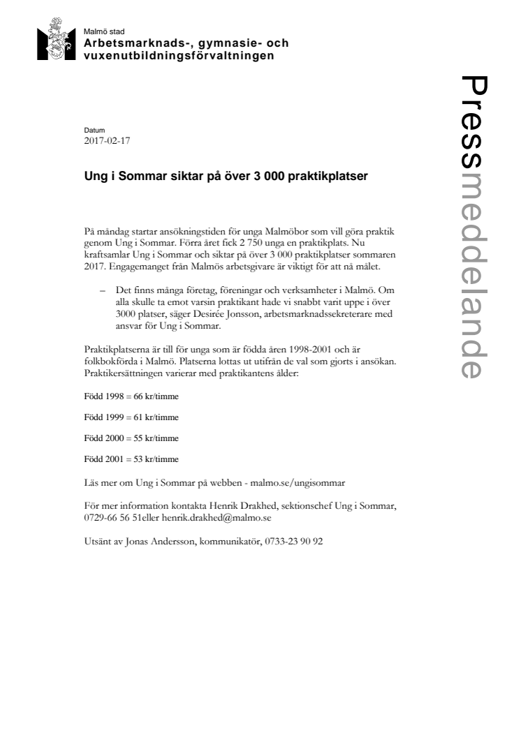 På måndag startar ansökningstiden för unga Malmöbor som vill göra praktik genom Ung i Sommar. Förra året fick 2 750 unga en praktikplats. Nu kraftsamlar Ung i Sommar och siktar på över 3 000 praktikplatser sommaren 2017.
