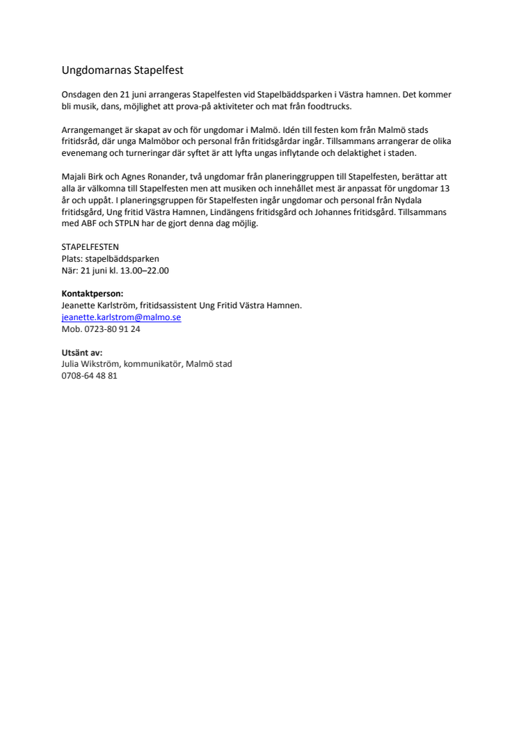 Onsdagen den 21 juni arrangeras Stapelfesten vid Stapelbäddsparken i Västra hamnen. Det kommer bli musik, dans, möjlighet att prova-på aktiviteter och mat från foodtrucks