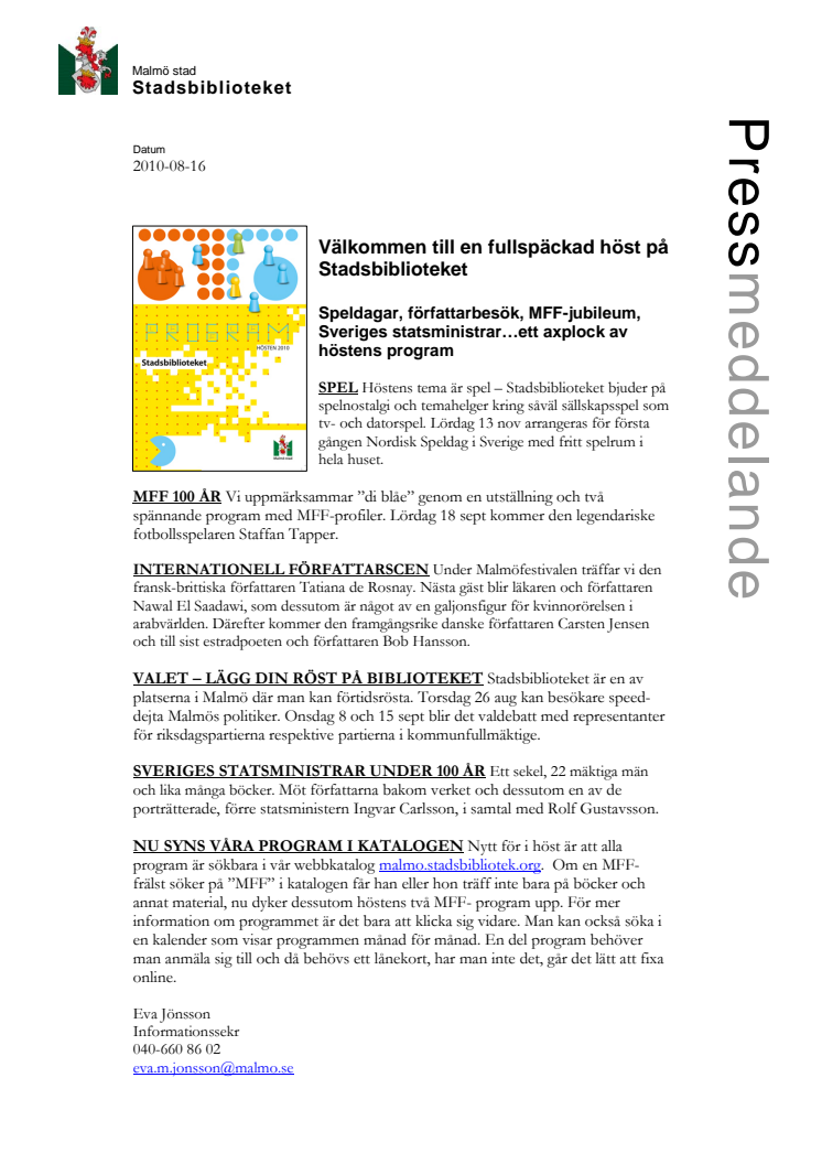Det blir en fullspäckad höst på Stadsbiblioteket i höst. "Spel" är höstens tema, det blir bland annat en Nordisk speldag.Vi uppmärksammar också att MFF fyller 100 år. Bibliotekets Internationell författarscen får spännande besök och inför valet blir det en rad program. Och som vanligt bjuder biblioteket på filmkaféer, boksamtal, sagostunder och mycket mer.