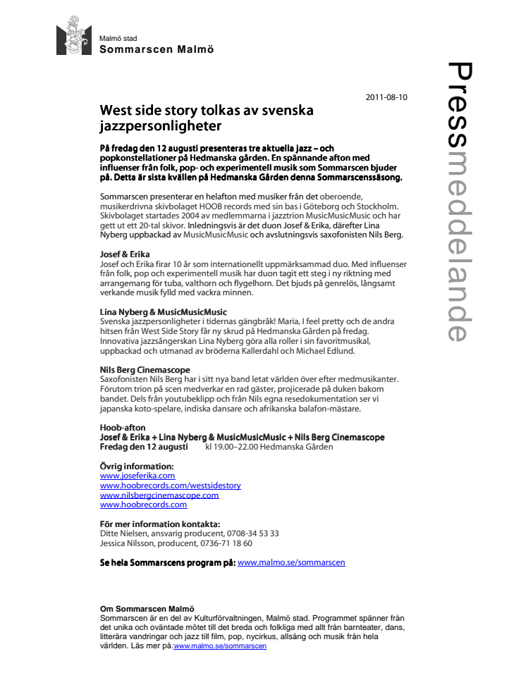 På fredag den 12 augusti presenteras tre aktuella jazz – och popkonstellationer på Hedmanska gården. En spännande afton med influenser från folk, pop- och experimentell musik som Sommarscen bjuder på. Detta är sista kvällen på Hedmanska Gården denna Sommarscenssäsong.