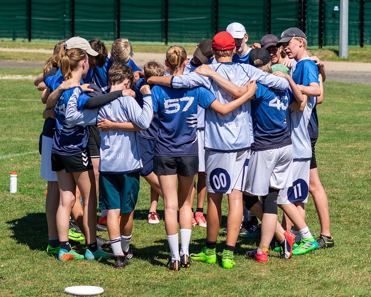 Skåneklubbarna Kockums Ultimate från Malmö och Akka Ultimate från Lund tackar varandra efter match i Öppna Danska Mästerskapen