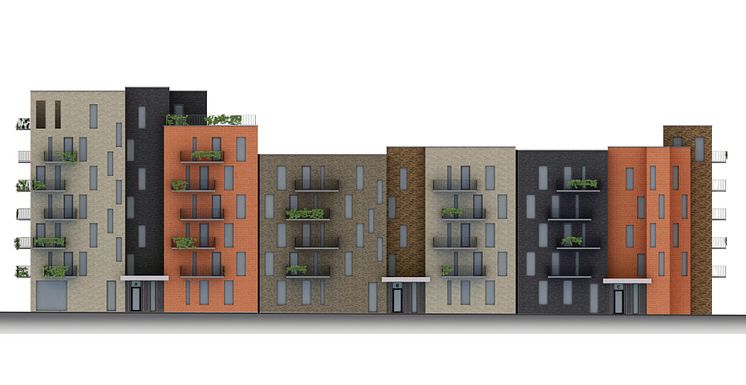 Fasad mot Nobelvägen, Trådbussen 1, Sorgenfri, Malmö. Illustration: Magnus Ståhl Arkitektbyrå AB
