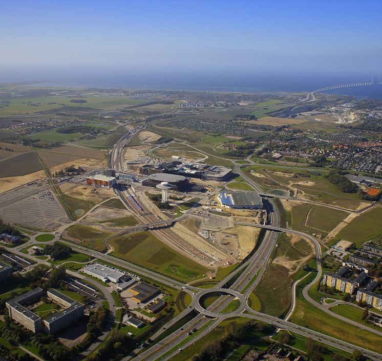Flygbild över utbyggnadsområdet Hyllie, i södra Malmö. Här ligger tågstation med en restid på 12 minuter till Kastrup och 5 minuter till Malmö C. År 2015 finns här 2 500 bostäder, 80 000 kvm kontorsyta, mässanläggning, interntionell skola, parker, badanläggning, hotell och två shoppingcenter. Utbyggnaden pågår för fullt. Foto taget 111005.