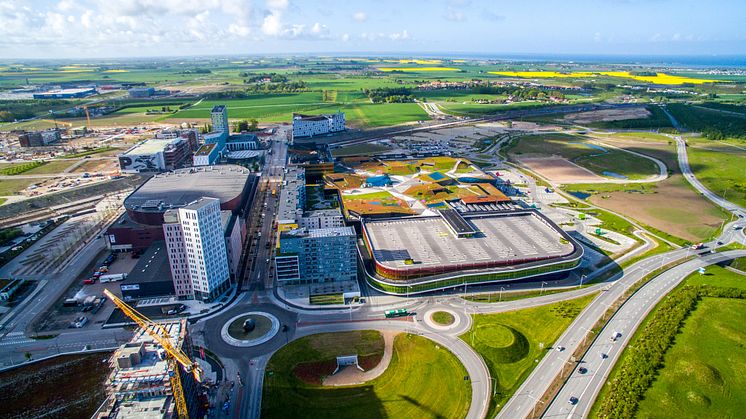 Från maj 2015. Motiv från norr mot söder. I bakgrunden syns IKEA varuhuset i Svågertorp och Hubhult i Vintrie Park, utbyggnadsområdets södra del.