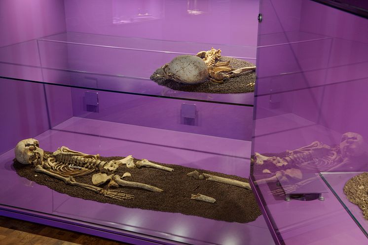 Malmö Museer: Ledtrådar - stolphål, DNA och andra spår från forntiden.Två kvinnor som hittades i samma grav. Nya spännande forskningsresultat som gjordes 2020 visar att den ena kvinnan hade smittkoppor 1000 år tidigare än forskningen hittills vetat att den fanns. Foto: Andreas Nilsson/Malmö Museer.