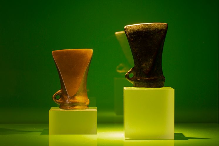 Malmö Museer: Ledtrådar - stolphål, DNA och andra spår från forntiden.Holkyxan av brons var en nymodighet under bronsålder. Yxan var kort och ihålig, allt för att spara in på metallen. I stället fylldes hålrummet ut av ett böjt träskaft. De små holkyxorna användes till snickeriarbeten, urgröpning av trästycken och till att hugga klenare träd och buskar. Foto: Andreas Nilsson/Malmö Museer.