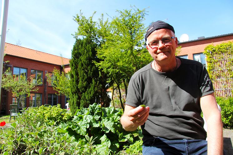 Roy Blad smakar på den färska dragonen som växer i Husiegårds grönsaksland.