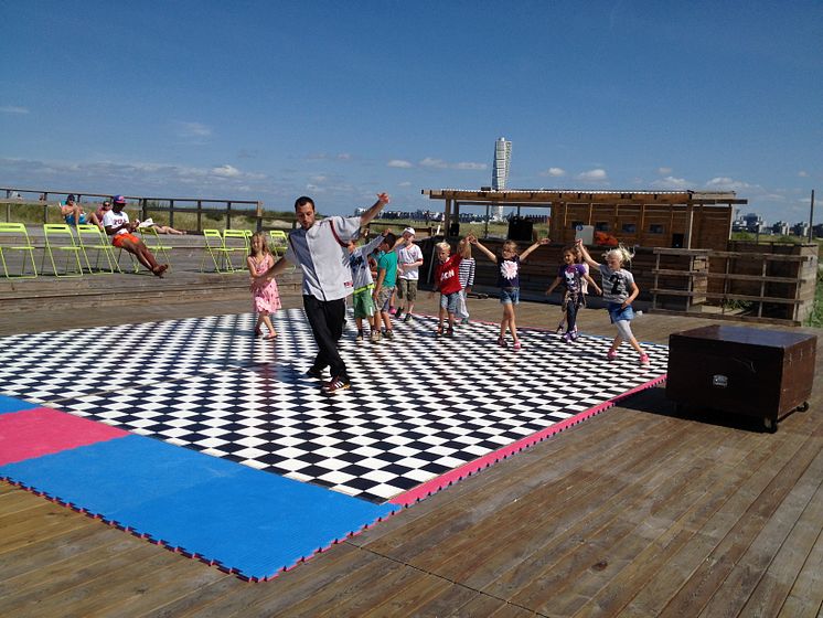 Bogdan Bizic från danskollektivet Above the Clouds lär barn breakdance.