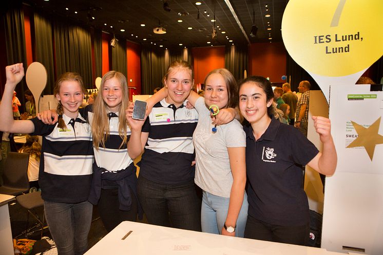 Malmö 20160521 Vinnarna i grundskoleklassen på InnoCarnival Skåne 2016, klass 7C från i Internationella Engelska skolan i Lund, med en apparat som skall lära flyktingar svenska.