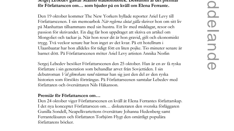 En intensiv vecka väntar Författarscenen i Malmö när Ariel Levy och Sergej Lebedev gästar Malmö stadsbibliotek. Dessutom är det premiär för Författarscen om… som bjuder på en kväll om Elena Ferrante.
