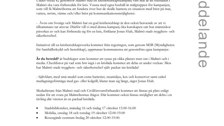 Under vecka 42 genomför Malmö stad en krisberedskapskampanj vars mål är att hushållen i Malmö ska vara förberedda för kris. Vuxna med egna hushåll är målgruppen för kampanjen, som vill få Malmöborna att fundera över hur de skulle hantera en situation med brist på mat, vatten, ström, värme och/eller brist på kommunikationsmöjligheter.