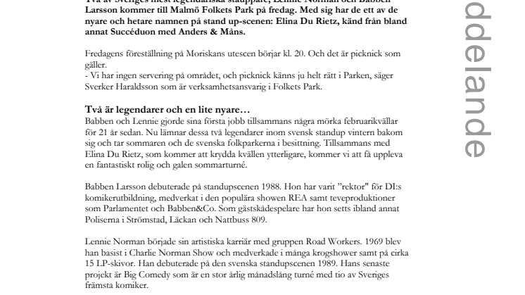 Två av Sveriges mest legendariska ståuppare; Lennie Norman och Babben Larsson kommer till Malmö Folkets Park på fredag. Med sig har de ett av de nyare och hetare namnen på stand up-scenen: Elina Du Rietz, känd från bland annat Succéduon med Anders & Måns.