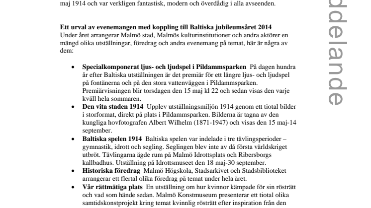 I år firas 100-årsjubileet av Baltiska utställningen som hölls i Malmö 1914. Under året arrangerar Malmö stad, Malmös kulturinstitutioner och andra aktörer en mängd olika utställningar, föredrag och andra evenemang för att fira Baltiska jubileumsåret. Nu lanseras www.baltiska2014.se - en sida med samlad information om jubileumsåret.