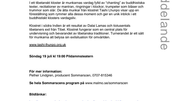 På söndag fylls Pildammsteatern av buddhistiska mantran, helig musik och maskerad dans. Tashi Lhunpo Monks besöker för första gången Sverige och bjuder på en inblick i ett tibetanskt klosters vardagsliv.