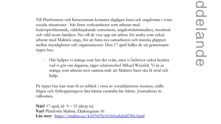 Till Plattformen och Kriscentrum kommer dagligen barn och ungdomar i svåra sociala situationer - här finns verksamheter som arbetar med hedersproblematik, våldsbejakande extremism, ungdomskriminalitet, missbruk och våld inom familjen. Nu vill de visa upp sitt arbete för andra som också arbetar med Malmös unga, för att hitta nya samarbeten och minska glappen mellan myndigheter och organisationer. Den 17 april håller de ett gemensamt öppet hus.