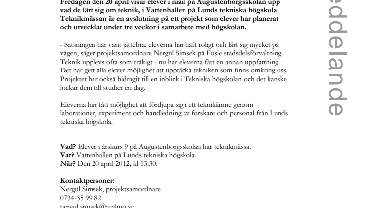 Fredagen den 20 april visar elever i nian på Augustenborgsskolan upp vad de lärt sig om teknik, i Vattenhallen på Lunds tekniska högskola.Teknikmässan är en avslutning på ett projekt som elever har planerat och utvecklat under tre veckor i samarbete med högskolan.