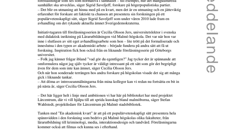 Den 19 januari startar Malmö högskola och Malmö stadsbibliotek föreläsningsserien En akademisk kvart. Föreläsningarna hålls varje onsdag kl 12.30–12.45 på Stadsbiblioteket i Malmö. Först ut är Sigrid Saveljeff, som berättar om det strategiska spelet då Sverigedemokraterna utmanar det politiska etablissemanget.
