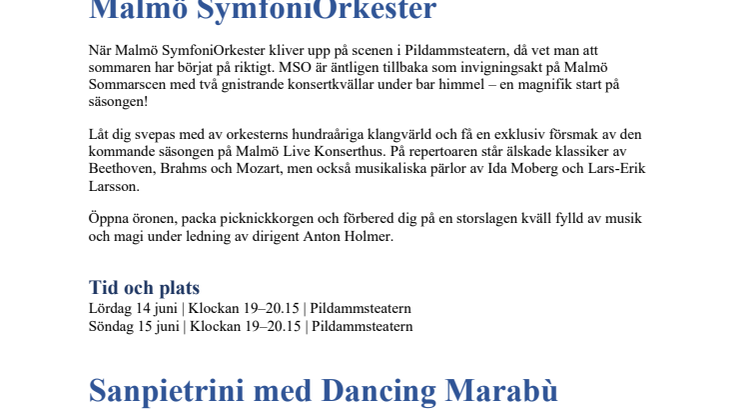 Den 14 juni startar årets upplaga av Malmö Sommarscen och vi kan se fram emot ett fullspäckat program med en helt unik blandning av nytt och traditionellt, det som skaver och det som överraskar. Först ut blir en riktig klassiker – Malmö SymfoniOrkester på Pildammsteatern är tillbaka! Bland årets nyheter hittar vi allsången som i år växer med fler språk och litteraturen som tar plats på Pildammsteatern. Musik från hela världen blir det när Fulu Miziki – en kongolesisk grupp med makalösa scenkläder och instrument av skrot, kommer till Sommarscen direkt från Europas största festivalscener. Och missa inte det argentinska rapfenomenet Trueno, vars megahit Mamichula har fått över 500 miljoner visningar på YouTube.