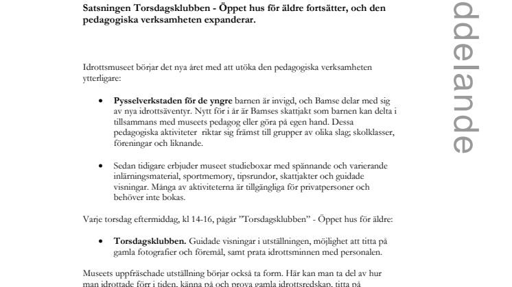 - Pysselverkstaden för de yngre barnen är invigd, och Bamse delar med sig av nya idrottsäventyr. Nytt för i år är Bamses skattjakt som barnen kan delta i tillsammans med museets pedagog eller göra på egen hand. Dessa pedagogiska aktiviteter riktar sig främst till grupper av olika slag; skolklasser, föreningar och liknande.