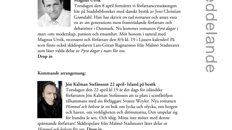 Torsdagen den 8 april fortsätter vi författarscenssäsongen här på Stadsbiblioteket med danskt besök av Jens Christian Grøndahl. Han har skrivit en rad romaner och anses vara en av sin generations mest framträdande författare och debattörer i Danmark. Nu kommer romanen Fyra dagar i mars -om moderskap, passion och ensamhet. Möt honom i samtal med Magnus Utvik, recensent och författare den 8/4 kl. 19 i Ljusets kalender! På scen finns också skådespelaren Lars-Göran Ragnarsson från Malmö Stadsteater som läser valda delar av Fyra dagar i mars för oss.